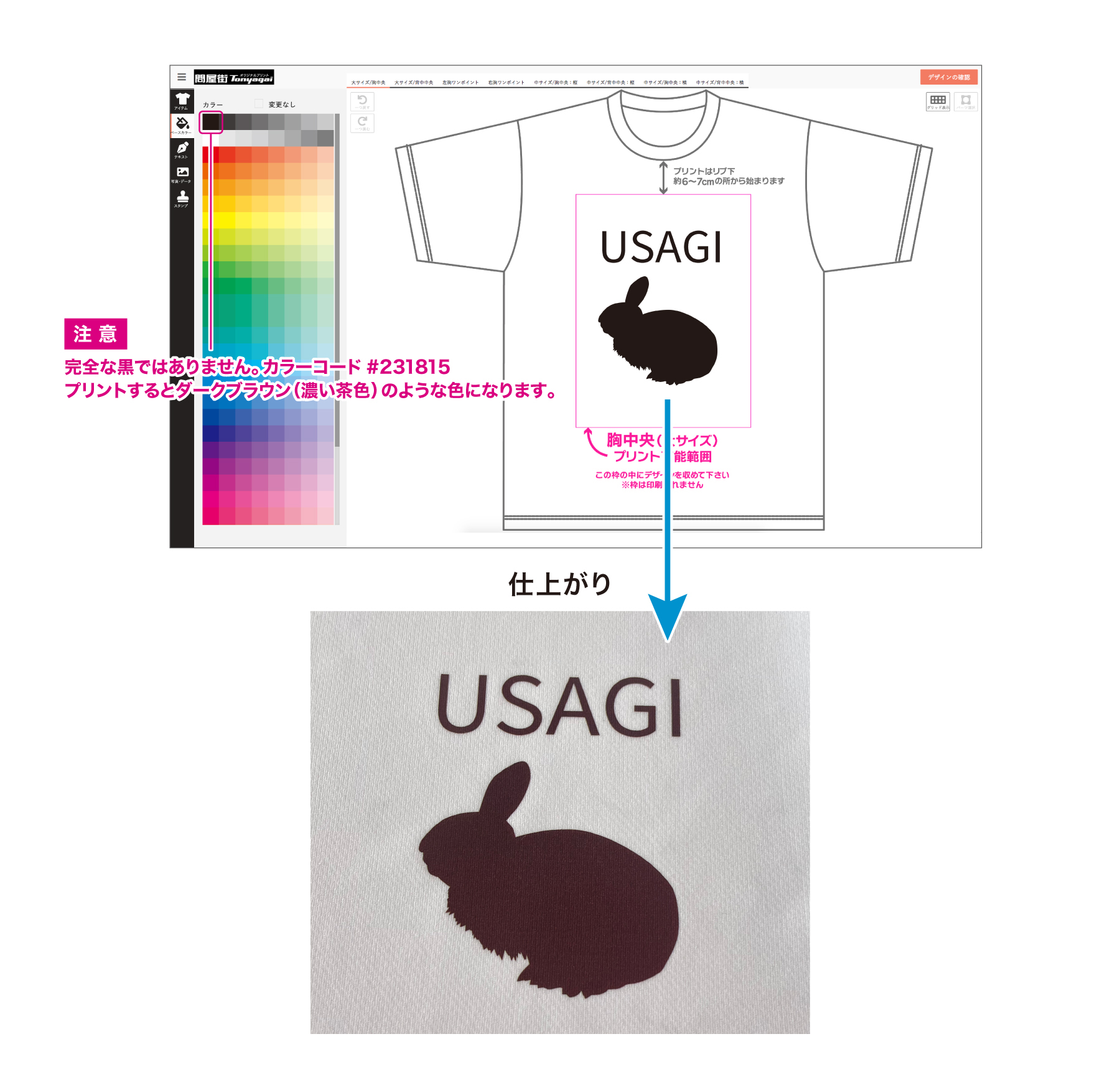 カラー変更が可能な部分(文字・スタンプ・背景)において、ベースカラーの左上の黒を選択した場合、仕上がりが濃い茶色となりますので、あらかじめご了承ください。